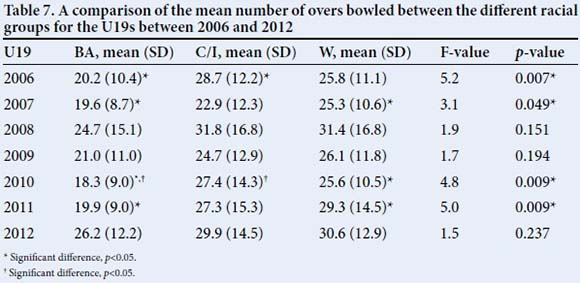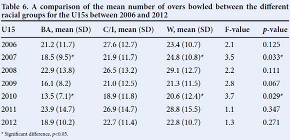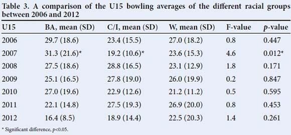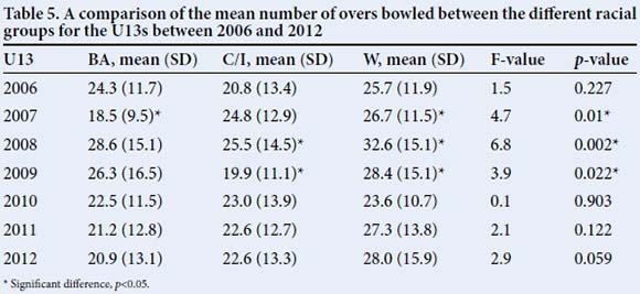 RESULTS: There were no significant differences in the bowling averages between BA bowlers and the other racial groups between 2008 and 2012. BA bowling averages were only significantly worse than W bowlers in the U13s in 2006 and U19s in 2007. BA bowling averages were also only significantly worse than C/I in the U13s and U15s in 2007. BA bowlers were below par representation in the top 20 wicket takers in each year for the U15s and U19s and below par representation for the U13s in 2007 - 2009 and 2011. The performance of C/I and W bowlers was relatively similar across the age groups. BA players bowled significantly fewer overs than W bowlers in the U13s in 2006, in the U15s in 2007 and 2009 and in the U19s in 2006, 2007, 2010 and 2011. C/I bowlers bowled significantly fewer overs than W bowlers in the U13s in 2008 and 2009.
