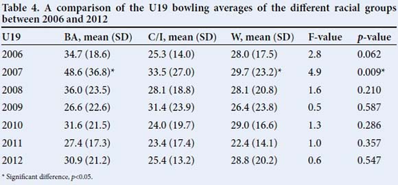 In the U19 age group, there were only significant differences in the performance of the three racial groups in 2007 (F2,118=4.9, p=0.009) (Table 4). Post hoc comparison of the three groups indicates that W bowlers had significantly better bowling averages (mean 29.7, 95% CI 18.87 - 31.02) compared with BA bowlers (mean 48.6, 95% CI 17.81 - 35.33, p=0.007). There were no significant differences in the bowling averages between the groups for 2006 and between 2008 and 2012.