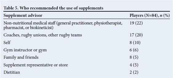 As has been found previously,[5,6] supplements were primarily recommended by coaches and medical practitioners (other than dietitians). This is of concern as a dietitian is uniquely qualified to assess each player's diet and to make recommendations accordingly.[4] The process of prescribing a supplement is an intensive one that requires an understanding of each player's habitual diet, medical history, lifestyle, access to food and training programme and periodisation. A dietitian can recommend the appropriate dietary principles to prevent deficiencies and optimise performance through a 'food first' approach and, if warranted, prescribe a supplement to be integrated into the overall nutrition plan.[3,4]