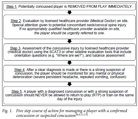 In contrast to the equivocal literature on Sideline Concussion Assessment Tools, there is substantial consensus on the management once a player is suspected of having sustained a concussion. Once a concussion is suspected (through either of the recommended methods), a medical professional trained in concussion management should immediately implement the five step on-field management procedure outlined in Figure 1. This diagram presents a summary of the four resources identified for this particular research question.[8,9,11,13]