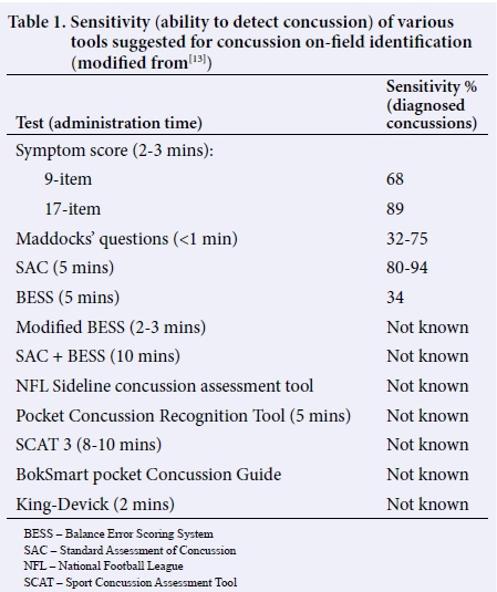 Despite the Consensus Statement on Concussion in Sport advocating them as "practical and effective", it is important to note that the sensitivity and specificity of the SCAT3 and pocket Concussion Recognition Tools (CRT) are yet to be assessed (Table 1).[13] Nonetheless, certain individual components of the SCAT3 and Pocket CRT, specifically the SAC and 17-point symptom scores assessment, have been associated with the highest sensitivities recorded for concussion screening tools (94 and 89%, respectively).[13]