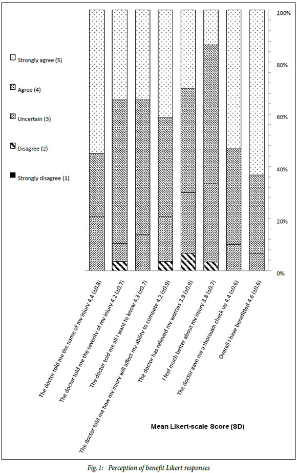 Most participants (93%) agreed that they had benefited from attending the injury clinic -with the remainder indicating 'uncertain'. Most responses (82%) were 'agree' or 'strongly agree' for all the statements in the questionnaire, indicating a consistently positive perception of the MIP.