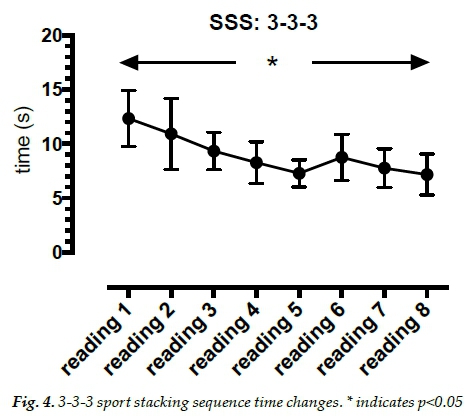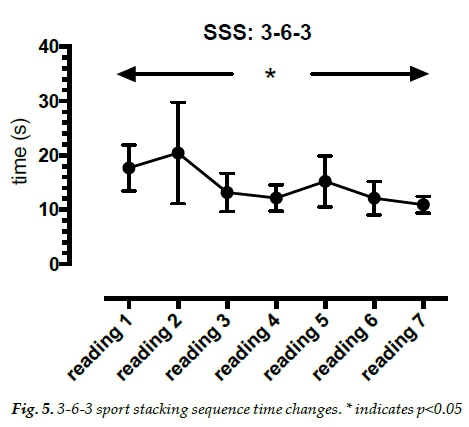 Results indicated improvements in sport stacking times. Average times clearly decreased over time (Figures 4, 5 and 6). There was a significant effect of time on stacking 3-3-3, F(7.42) = 19.2, p<0.0005). There was a significant effect of time on stacking 3-6-3, F(1.43) = 6.1, p=0.029). There was a significant effect of time on stacking the cycle, F(2.14) = 20.0, p<0.0005).