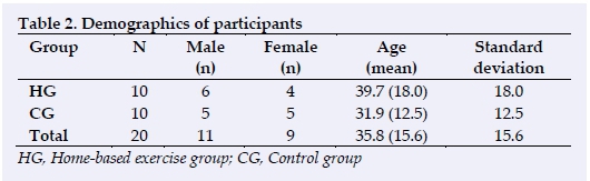 A quantitative, experimental, randomised controlled trial design was used in this research. The groups were matched by gender and age, and the participants were blinded in terms of group allocation. The effectiveness of a four-week home-based exercise programme was compared to a control group at posttest. Both groups were followed for a further four weeks after the intervention period to assess the effectiveness of the exercise programme. Thus, the whole experiment was conducted over an eight-week period. At the end of the study, the control group was offered the same protocol that was given to the exercise intervention group. The study protocol was approved by the University of Johannesburg's Faculty of Health Sciences Research Ethics Committee (South Africa) (REC-241112-035).