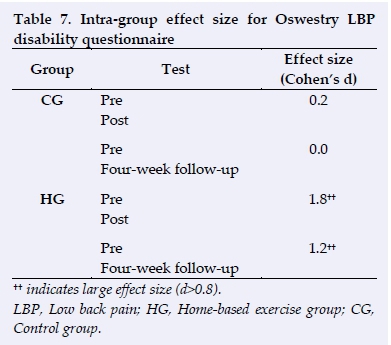 RESULTS: Following the home-based exercise intervention there were significant improvements observed in low back pain and function for the HG. The HG's Oswestry scores improved significantly (p=0.005) and their VASP also showed a significant improvement (p=0.011). Significant improvements also occurred between the pre-test and four-week follow-up for the HG's Oswestry score (p=0.021) and for the HG's VASP (p=0.005). No significant improvement was found for the CG between pretest and post-test or between pretest and the four-week follow-up. Large effect sizes (d>0.8) were also observed for the HG between the pretest and the post-test (d=1.6), as well as between the HG and the CG at post-test (d=1.5) and at the four-week follow-up (d=1.6).