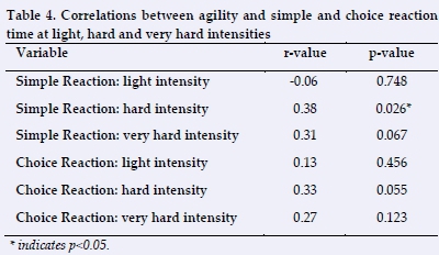There was significant, but weak positive correlation between bicycle-specific agility and SRT at a 'hard intensity' (r=0.38, p=0.026). There were no other significant relationships between RT and agility (Table 4).
