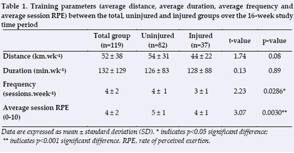 No significant difference was found between the injured and uninjured group in average cumulative distance and average cumulative duration per week. A significant difference was found between the two groups for average frequency (p=0.0286) and average sessional RPE per week (p=0.0030) (Table 1). On average, the uninjured group ran significantly more times per week than the injured group and at a significantly higher intensity.