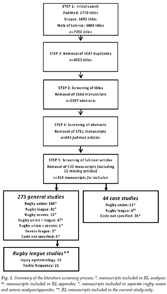 A search was conducted for publications that reported tackle-specific factors in RL (rugby union and sevens were included in the search and analysed separately)[10] according to systematic review guidelines.[12,13] Three electronic databases (PubMed, Scopus and Web of Science) were searched using the keyword combinations 'rugby' AND 'contact', 'rugby' AND 'tackle', and 'rugby' AND 'league' AND 'injur*'.