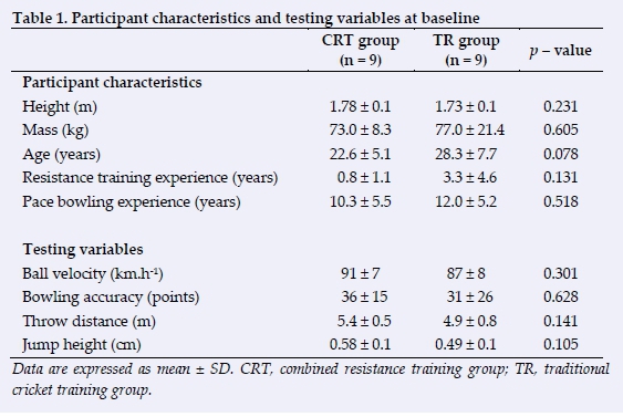 Eighteen male, club level (1st and 2nd division) cricketers were recruited for the study (Table 1). All the participants had been injury-free for at least one month prior to the start of the study. A quasi-experimental design was employed. The participants were divided into a combined resistance training (CRT) group (n=9) and a traditional cricket training (TR) (n=9) group. Selection of players into the CRT group was based on the coaches' and players' willingness to allow the training to occur in conjunction with their regular training. Furthermore, the TR and CRT groups were recruited such that no two players from different groups would see the other train. Written informed consent was obtained from all participants prior to commencement of the study. The study had been approved by the authors' institutional ethics review board (No. 2016FBREC359).
