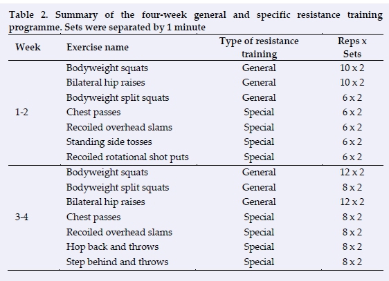 The four-week programme consisted of a combination of general, special (Table 2), and specific resistance training (Table 3). The training programme coincided with the players' regular cricket net training, which occurred twice a week. The weighted implement bowling occurred first, and thereafter, the general and special resistance training was completed. Training sessions were separated by approximately 48 hours between sessions.