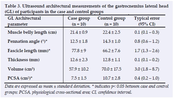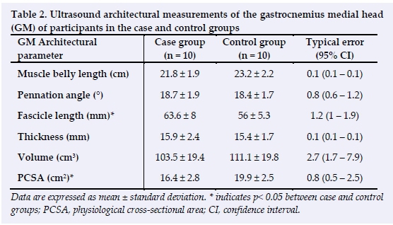 RESULTS: Gastrocnemius Medial Head (GM) fascicle length was significantly greater (p = 0.02), whilst the physiological cross-sectional area (PCSA) was significantly less (p = 0.01) in the case group. Gastrocnemius Lateral Head (GL) pennation angle (p = 0.01) and PCSA (p = 0.01) were significantly lower, whilst fascicle length was significantly greater (p = 0.01) in the case group. There were no significant between-group differences in GM and GL muscle thickness, muscle belly length, or muscle volume.