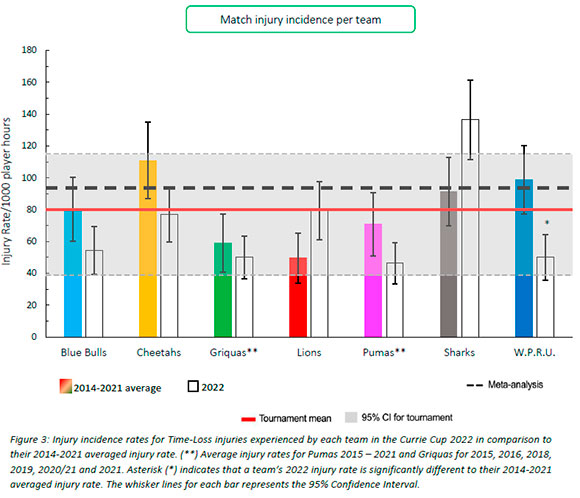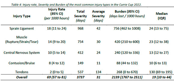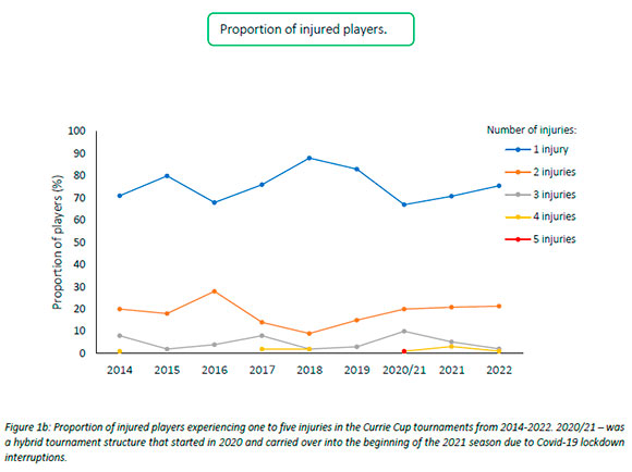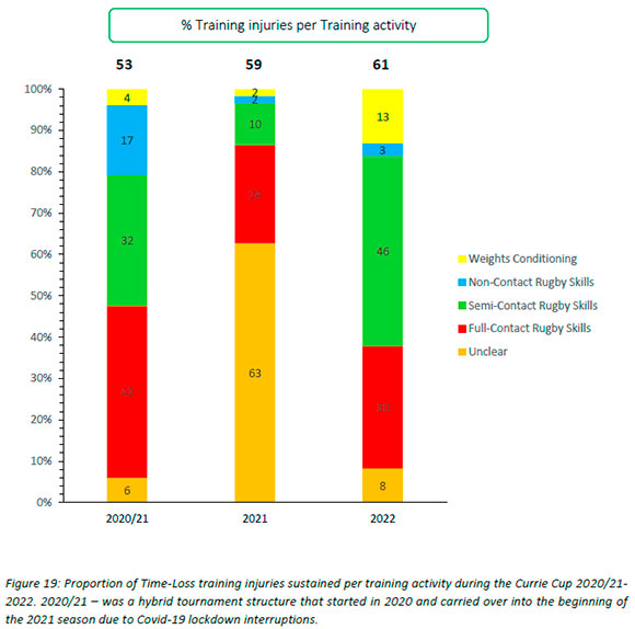 Overall, concussions contributed to 3 training injuries throughout the Currie Cup 2022 (3%). This is similar to the 2020/21 and 2021 Currie Cup seasons.