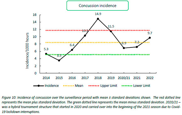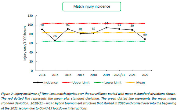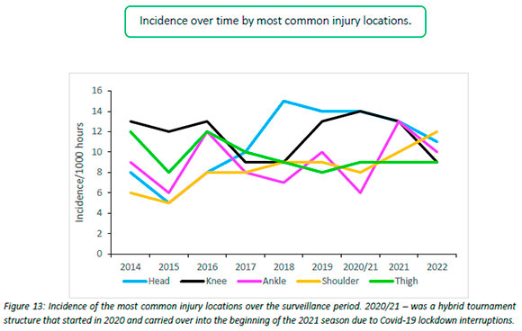 Figure 13 displays the movement of the most common injured body locations over the surveillance period (2014-2022). When examining the injury incidence patterns over the past nine years, a clear upward trend can be observed in shoulder injuries since the 2020/21 season, with a gradual increase since 2015. In the 2022 season, shoulder injuries reached the highest level recorded in the past nine years. Thigh injuries have levelled out over the past three years. Head injuries increased initially from 2015 to 2018, after which they stabilised and are on a downward trend since then (Figure 13). The trend is not the same, but the head injury data here links directly to the concussion section earlier in the report, since most head injuries were attributed to concussions.