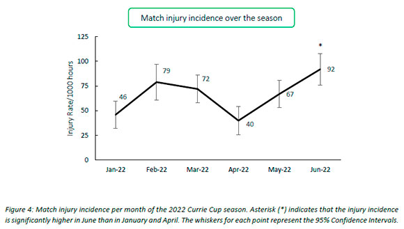 The 2022 Currie Cup tournament consisted of two rounds of matches and took place from January to June. Unlike previous years, when the competition was held in the second half of the year and either had one or two rounds, this year's format was changed to a double round competition in the first half of the year. When examining the Time-loss injury incidence during the 2022 Currie Cup tournament, it was found that the injury incidence in June was significantly higher compared to January and April. Throughout the other months in the 2022 season, there were no significant differences (Figure 4).