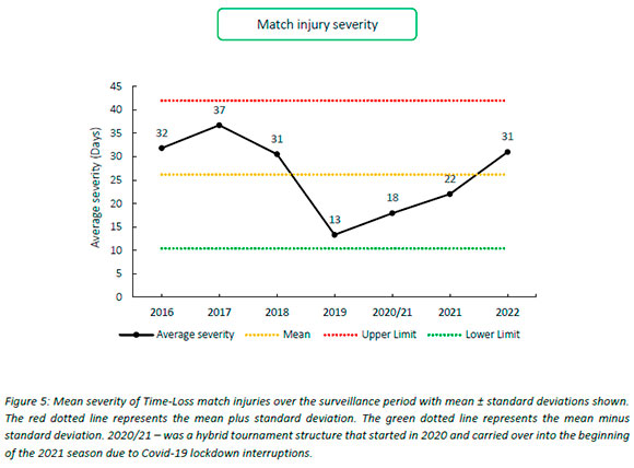 The average severity of match injuries for the Currie Cup 2022 was 31 days, which is higher than the averaged severities for the Currie Cup tournament 2016-2021 (25 days) but was within the expected season-to-season variation (Figure 5). There has been a consistent increase in match severity since 2019, although it has not exceeded the level observed between 2016 and 2018. The median severity in 2022 was 19 days (IQR 10 to 44). This means that the half-way mark of the injury severities was 19 days, with 25% of all Time-Loss injuries lasting 10 days or less and 25% lasting 44 days or longer.
