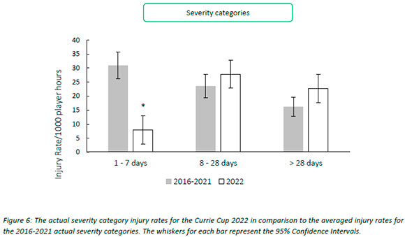 Figure 6 compares the injury severity rates for the Currie Cup 2022 tournament to the averaged injury severity rates of the 2016-2021 tournaments. Injury rates in the severity category of '1-7 days' were significantly lower in 2022 compared to their 2016-2021 average (Figure 6). Interestingly, the injury severity categories in 2022 show a trend towards more severe injuries as opposed to the trend demonstrated by the 2016-2021 accumulated data, which has a trend towards the less severe injuries.