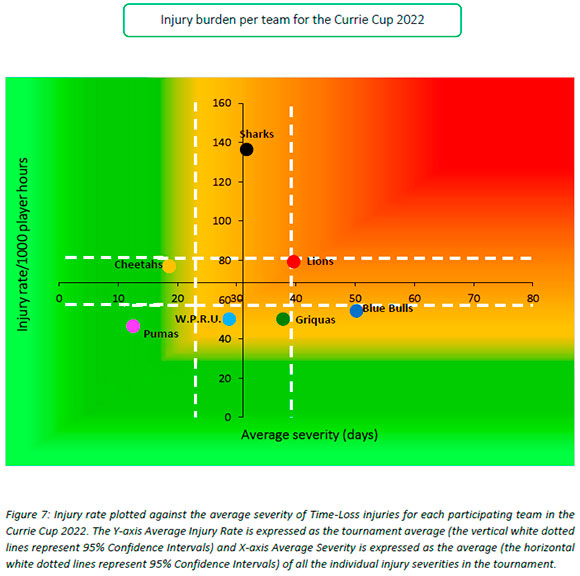 The Cell C Sharks had the highest Time-Loss injury rate by quite some distance, followed by the Sigma Golden Lions and then Toyota Free State Cheetahs. In contrast, the Airlink Pumas had the lowest injury rate, the lowest severity, and by extension the lowest injury burden per team (Table 1; Figure 7). It has been shown in previous studies that teams with lower injury rates had more success in the Currie Cup competition [6, 7]. It has also been shown that injury burden needs to be considered for success and not simply injury rates alone [8]. Teams who fall in the green zone (below average and 95%CI), will generally not be impacted as much by their injury burden, regardless of whether their injury rate or average severity is relatively high. As soon as the combination of rate and severity moves into the orange (close to average) and/or red zone (above average and 95% CI), the impact on team performance and player availability becomes more problematic. None of the teams participating in the 2022 Currie Cup were in the red zones. However, Cell C Sharks showed the highest injury burden because of their combination of high injury rates and severity. This was followed by the Sigma Golden Lions.