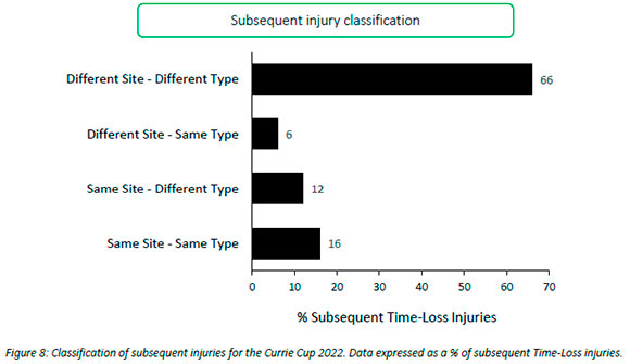 A subsequent recurrent injury was any subsequent injury classified as 'same site - same type', which refers to the same location and same tissue type involved as the original index injury. Only four subsequent recurrent injuries occurred in the Currie Cup 2022.