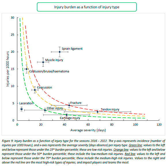 Figure 9 shows the injury burden for the period 2016-2022. Ligament sprain followed by muscle injury were the two injury types with the highest burden when data were combined for the 2016-2022 Currie Cup tournaments. These injury types have the highest combination of injury incidence and average severity of injury. Consistent with previous reports, these two injury types continue to dominate across the different teams.