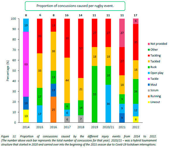 Figure 12 presents the mechanisms contributing to concussions in Tackling, Tackled, Ruck and the remaining concussion causing injury events from 2015 - 2022. Data have only been presented from 2015 onwards as Tackle related data were not captured separately for the Tackler and Ball Carrier in 2014.