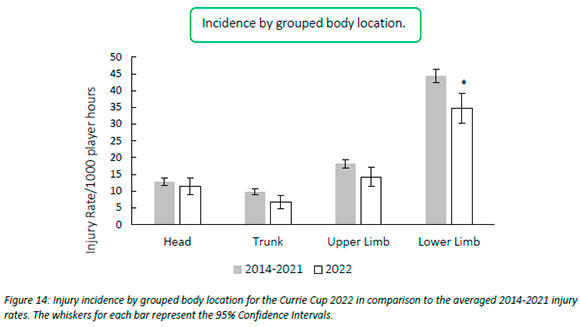 During the Currie Cup 2022, lower limb injury rates were significantly lower than their 2014-2021 averaged injury rates (Figure 14). During the Currie Cup 2022, the shoulder and head areas had the highest injury rates, with 12 (7 to 17) and 11 (6 to 16) injuries per 1000 player hours, respectively. The shoulder injury rate is similar to the meta-analysis [1] injury rate of 12 (10 to 14) injuries per 1000 player hours and the head injury rate was lower than that of the international meta-analysis [1] of 17 (14 to 20) injuries per 1000 player hours.