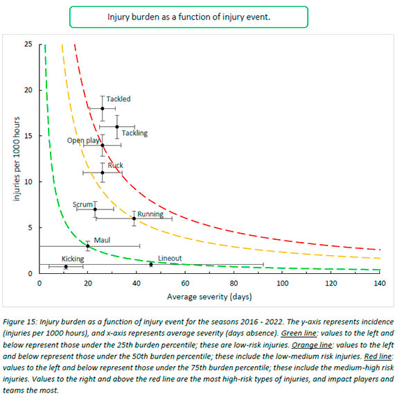 Figure 15 combines all the injury types from 2016 - 2022 and presents the injury burden picture over the past seven years. Injuries caused by Tackling have the highest injury burden for all teams, followed closely by injuries from being tackled. Both these injury events have a high combined injury incidence and average severity. Open play followed closely behind these two injury-causing events.