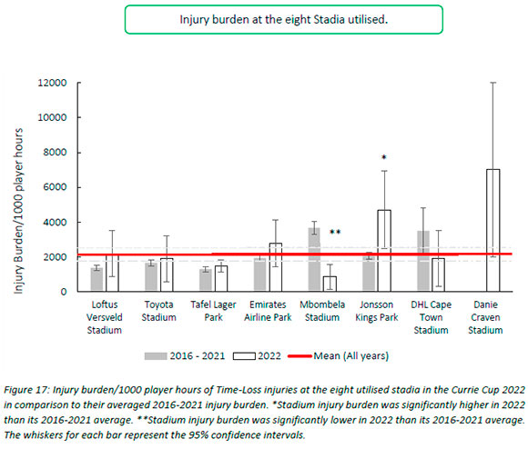 Table 9 shows the ranking of injury burden of the Stadia from the highest to lowest between 20162022. When combining the last seven season's data, it highlights that the Danie Craven Stadium, followed by Mbombela Stadium recorded the highest injury burdens overall, with only Mbombela's averaged injury burden being significantly higher than the grouped average injury burden from 20162022 (Table 9).