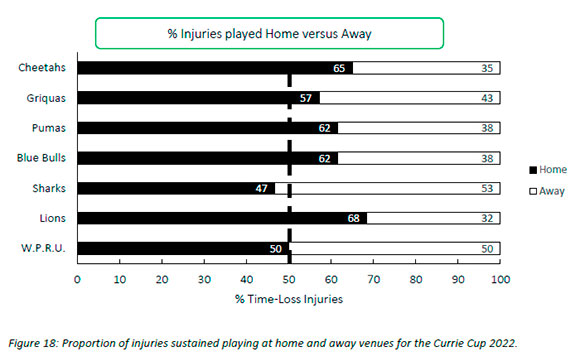 Figure 18 presents the proportion of injuries sustained playing at home and away venues in the Currie Cup 2022. When comparing injuries while playing away and at home in the Currie Cup 2022 tournament, playing at home at 40 (31 to 49) injuries per 1000 player hours, recorded a higher injury rate to playing away with 29 (21 to 37) injuries per 1000 player hours, but was not significantly different. With the exceptions of the Cell C Sharks and DHL Western Province (W.P.R.U.), all teams experienced more injuries when playing at home compared to playing away. DHL Western Province (W.P.R.U.) had an equal distribution of injuries at home and away matches, while Cell C Sharks experienced more injuries playing away.