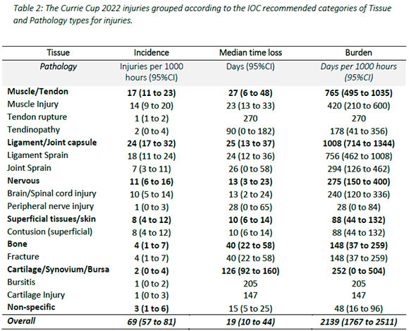 All the data in this report are aligned with the 2019 IOC consensus statement [2] and are further presented as such to compare against previous season reports and the international meta-analysis [1]. Table 2 presents the Currie Cup 2022 injury data in the format recommended by the 2019 IOC consensus statement. This table provides an overview of the Tissue and Pathology types of injuries sustained during the 2022 season. This format is used throughout this report.
