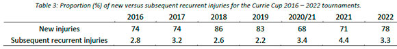 There is a slight increase in the proportion of new injuries and a corresponding decrease in subsequent recurrent injuries compared to the Currie Cup 2021 tournament (Table 3).
