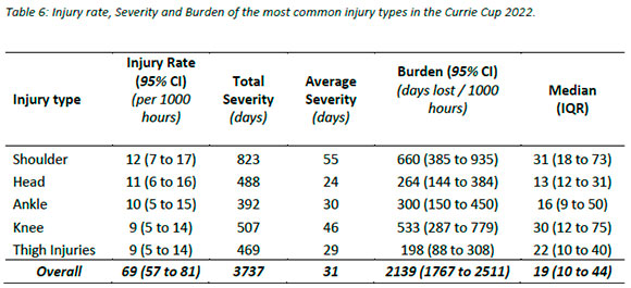 The average severity for shoulder injuries was 55 days absent and injury burden 660 days absent per 1000 player hours: the highest injury severity and burden. This was followed by knee injuries with 46 and 533 days respectively. Head injuries had an average severity of 24 days absent, and an injury burden of 264 days absent per 1000 player hours. Thigh injuries had the lowest average severity of 29 days absent, and an injury burden of 198 days absent per 1000 player hours. The median severity of shoulder injuries was the highest in the Currie Cup 2022 at 31 days absent. Twenty-five percent of shoulder injuries resulted in 18 or less days lost from training and matches, and 25% of all shoulder injuries resulted in 73 or more days lost from training and matches (Table 6).