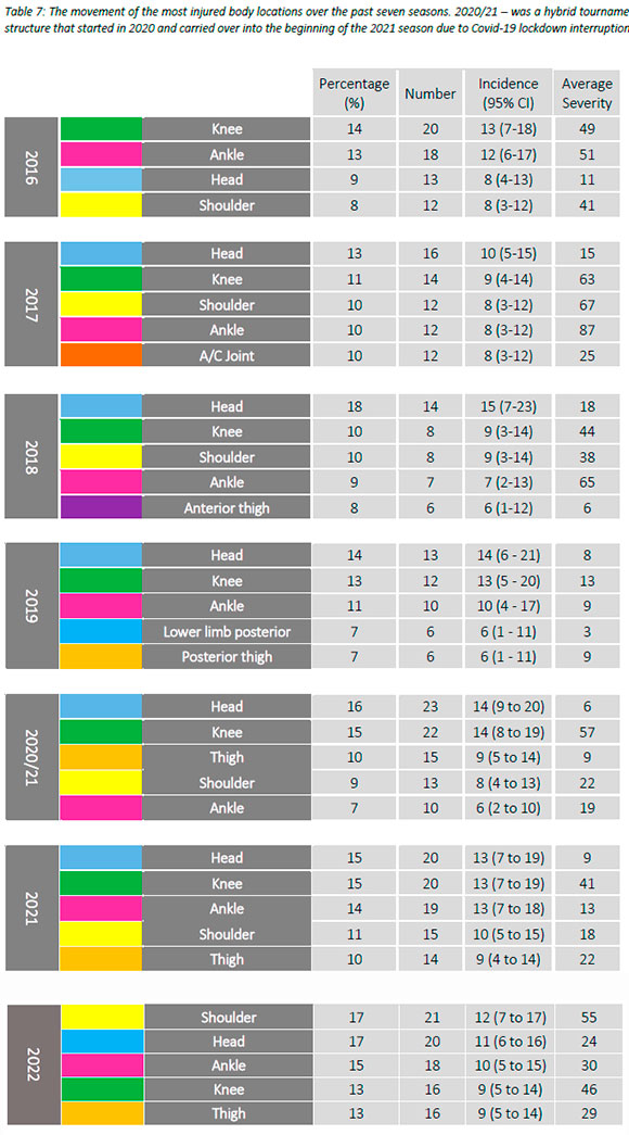 When analysing the changes in incidence of the most injured body locations for the Currie Cup over the past seven seasons (2016-2022), the head consistently ranks high on the list of the most frequently injured body locations. However, the shoulder has taken the top spot and increased by 6% since the 2021 season with knee injuries moving down the list (Table 7).