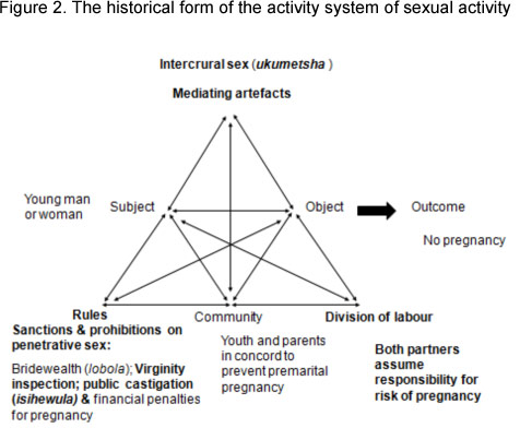In the study an historical account of sexual activity was obtained through a reading of historical and anthropological accounts of sexual socialization in contexts similar to that in which the research was conducted, that is, the rural Eastern Cape (Hunter, 1936; Mayer & Mayer, 1970; Delius & Glaser, 2002). Although these accounts are embedded in the wider ideological narratives of the time and have been criticised (for example, for reflecting a particular construction of African sexuality in a "golden age"), they allow for a broad contextualisation of practices, revealing and exposing historical tensions and contradictions in sexual activity which affect the current nature of sexual activity. An historical form of the activity system was generated using these accounts and the rich personalised accounts of the older research participants born between 1930 and 1973. This artificial historical periodisation was useful in understanding the development of the current phase of the activity system. Data from the research participants born after 1973 were used to generate a current form of the activity system.