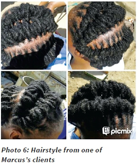 First, I need to acknowledge that I went into this interview in 2007 with an agenda of wanting to find out whether Marcus was gay or not because other boys involved in the research told me that Marcus was gay and was not supposed to be involved in the project as this project was only for boys. I guess these boys telling me about Marcus being gay revealed how boys police each other in terms of sexualities (Britton, 1990; Davison, 2007). It is therefore important that strict boundaries are maintained in research as gay boys are subjected to homophobic attacks within the school environment (Pascoe, 2007). My questions in the above extract reveal that I was explicitly pushing Marcus to say something about his sexual identity. With hindsight and self-reflection now, I was also able to uncover my own prejudices in associating certain occupations (for example, hairdressing) with being gay. In the interview, Marcus denied that he was gay, "No, I am not [gay]". He said that he knew that the other boys at school thought he was gay, but he was not bothered because he knew he was not. However, five years after leaving high school, in one of our follow-up interviews, Marcus disclosed that he was gay. He said that he was not ready to tell anyone else about his sexuality while he was still at school because the school environment was hostile and homophobic towards gay boys. He asserted that he felt safe to disclose his sexuality to me, as I have been non-judgmental in our interactions since we met while he was still at high school. He reflected that the research process has helped him to think and introspect about many things in his life. Atthe time of writing, 27-year-old Marcus was working at a salon in Sandton asa hairstylist after completing a diploma in Cosmetology at the College of Johannesburg. He felt liberated that he had come out about his sexuality as a gay man and acknowledged that our follow-up interviews had made him feel safe enough to reflect about himself and had built his confidence to come out. He asserted he was happy about being gay, especially his job of being a hairstylist. Marcus took Photos 6 and 7 concerning his job as a hairdresser.