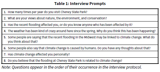 TL conducted all interviews in early August of 2019 at a variety of public park facilities at CSP including campgrounds, day-use areas, and beaches. He conducted thirty-nine interviews in English and two in Spanish at the request of two Spanish-speaking participants. After participants consented to participate, he asked them to step away from others to ensure a confidential conversation. He asked participants a brief series of questions about their perceptions of extreme weather, experience with recent flooding, beliefs about a relationship between recent flooding and climate change, and relationship with the park and understanding of environmentalism (Table 1). Finally, he asked participants to complete a brief demographics questionnaire, debriefed them regarding the purposes of the study, and compensated them for their participation in the form of a drink insulator worth USD $2.
