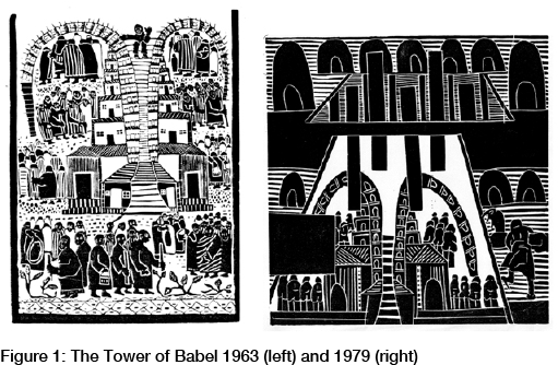 Azaria Mbatha19 of Rorke's Drift20 bases most of his art on Biblical themes. He also emphasizes the important role of art in resistance readings of the Bible. Nadine Gordimer notes that art was "at the heart of liberation" (De Gruchy 2001:204). Mbatha (Eichel 1986:7) states he hopes that, "in portraying the African experience, I am also expressing the powerlessness and isolation of these people". He created two artworks based on the Tower of Babel narrative entitled The Tower of Babel21. The first was in 1963 and the other in 1979. See Figure 1 The Tower of Babel 1963 and 1979.