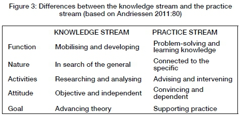 The practice stream includes activities focused on a concrete practice or case in which generic knowledge is used to solve the problem in a specific situation or to support the learning process of professionals in a specific case. Professionals and organisations are interested in this specific case, or this specific intervention design. What are the effects of this intervention or design in this specific context? The main task of the researcher in the practice stream is to advise, facilitate and support the change process. Depending on the model of the connection between the roles of the researcher, the researched and the problem owner (see above), the attitude of the researcher can be more involved and steering. In other words, the researcher as advisor takes (partly) responsibility for the change within a specific context or organisation.