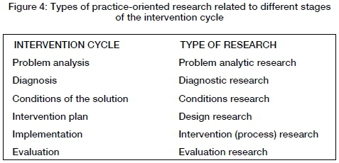 One can distinguish different types of practice-oriented research related to the different stages of the intervention cycle. The types are labelled according to the stages that are the focus of the research (see Figure 4). For example, problem analytic research focuses only on problem analysis. Characteristic of this type of research are descriptive questions to map the situation in relation to the action problem (Who? What? Where?). What is the impact on professionals and/or congregations? To what degree can this problem be influenced and changed?