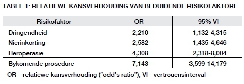 Na 'n stapsgewyse, logistiese regressie het vier faktore as spesifieke risikofaktore vir mortaliteit oorgebly. Die risikofaktore is die dringendheid van die operasie, ingekorte nierfunksie, 'n tweede of meer hartoperasie en 'n bykomende prosedure (Tabel 1).