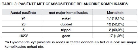 Afgesien van die 53 sterftes het 'n verdere 91 pasiënte een of meer major komplikasie gehad. Bykans 92% van pasiënte het die hospitaal sonder mortaliteit of major morbiditeit verlaat. Ook dié uitkoms van major morbiditeite weeg visueel baie gunstig met twee ander internasionale databasisse. Sommige pasiënte het meer as een en tot soveel as drie belangrike komplikasies gehad. Die impak op sterfte in die hospitaal van pasiënte met geen komplikasie teenoor pasiënte met een of meer komplikasie is duidelik (Tabel 3). Pasiënte sonder enige belangrike komplikasie se mortaliteit was slegs 1,0%. Agtien persent van die pasiënte met een komplikasie is oorlede teenoor die helfte van die met twee of meer komplikasies.