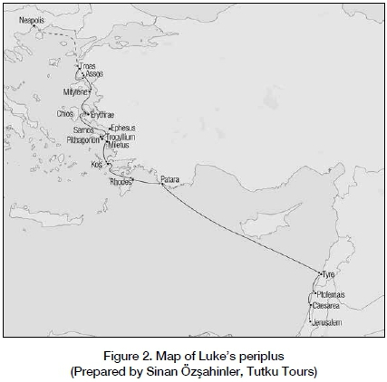 Because of its place in the New Testament, the canon of over two billion Christians throughout the world, the Acts of the Apostles is undoubtedly the most widely read work of Greco-Roman historiography today.3 One of the most detailed accounts of a sea journey in ancient literature is recorded in Acts 20:6-21:8.4 The context is Paul's third journey that began with his departure from the province of Macedonia to his final destination in Jerusalem.5 Luke identifies seven named men travelling with Paul "who present the fruit of Paul's labors in the various areas of his work" (Tannehill 1990:246).6 The seven departed from Philippi's port of Neapolis (cf. Acts 16:11) and transshipped across the northern Aegean to Alexandria Troas.7 Paul, however, remained behind in Philippi to celebrate the Feast of Unleavened Bread. This section is among the three "we" passages8in Acts where the narrator purports to accompany the apostle. Paul and the narrator then later sailed to Troas, a journey of five days (Acts 20:6). Since his journey in the opposite direction on the second journey only took two days (Acts 16:11), Gloag (1870:2.234) rightly assumes that "they were perhaps hindered by contrary winds or by a calm sea". This delay caused Paul to miss the weekly gathering of Christians in Troas, so he was forced to stay an additional seven days to meet with them on the following Sunday evening on the first day of the week.9