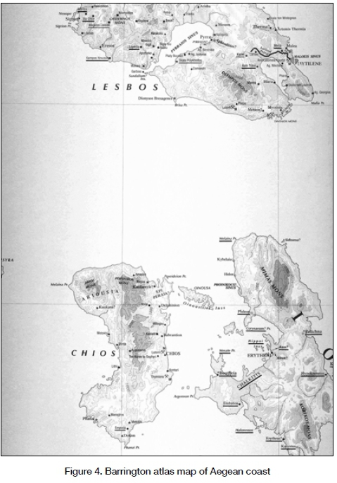 The following atlases depict Paul stopping at Chios Island: Zondervan atlas of the Bible revised (Rasmussen 2010:231) and Carta's New Century handbook and atlas of the Bible (Rainey & Notley 2007:246), while the HarperCollins atlas of Bible history (Pritchard 2008:167) and the new Moody atlas of the Bible (Beitzel 2009:261 map 112) show the stop at Chios city. Only the Oxford Bible Atlas (Curtis 2009:169) fails to show Paul landing at Chios Island or city but instead shows a route coming close to the coast of Asia Minor.33 The Crossway ESV Bible atlas (Currid & Barrett 2010:247) and the IVP atlas of Bible history (2006:161) are representative of those atlases that simply show the route passing through the channel without touching any land.