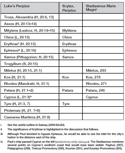 This article has proposed that Luke's account of Paul's third journey on the Aegean and Mediterranean Seas falls under the ancient genre of periplus. What is remarkable about this extended itinerary is that a timetable for its execution can also be suggested. In considering the textual conundrum in Acts 20:15, one question might well be asked: Why doesn't Luke provide the name of Erythrae in the text? This omission should not pose an obstacle because in other places in Acts the name of the port is omitted. Paul's landing at Seleucia Pieria (14:26; cf. 13:4) and departure from Neapolis (20:6; cf. 16:11) are unmentioned; the ports of Samos (Pythagorion) and Rhodes where Paul landed are unspecified (20:15; 21:1); Andriake is not mentioned as Myra's port (27:5), and the port in Malta from which Paul's grain ship sailed is unnamed (28:11). Besides the grammatical and geographical arguments for identifying Erythrae as the port of landing "opposite Chios", a final consideration relates to local tradition. It is remarkable that, unlike most other cities along the itinerary, there are no traditions related to Paul's visit to Chios or churches dedicated to him on the island.39 For this reason Fant and Reddish (2003:80-83; 116-125) do not include Chios in their guidebook of Greece's biblical sites; however, they do include Mitylene and Samos, the ports immediately before and after Paul's stop "opposite Chios".