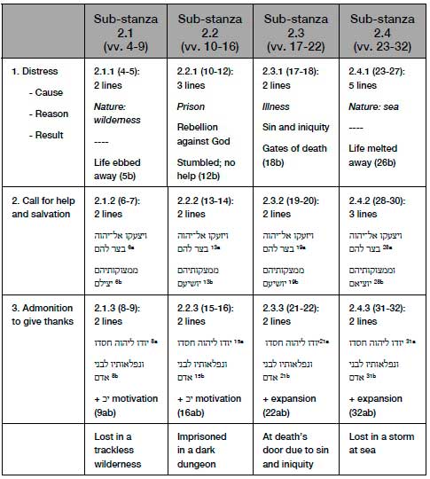 As the first poem in Book V of the Psalter, Psalm 107 plays an important role in the book's overall architecture (Hossfeld & Zenger 2011:101-102). The connection between the urgent prayer for salvation, in order that Yhwh may be thanked and praised by his people in Psalm 106:47, and the call to thanksgiving by those who experienced his acts of salvation in Psalm 107:1-3 speaks for itself. The command הודו ליהוה (Ps. 107:1a) also occurs in Psalms 105:1 and 106:1. In both Psalms 106 and 107, the call is accompanied by a double motivation כי־טוב and כי לעולם חסדו). The same call frames Psalm 118 (vv. 1, 29) and introduces Psalm 136 (v. 1). The phrase כי לעולם חסדו also occurs in Psalm 118:2-4 and Psalm 136:2-26. Psalm 107 thus has links backward to Book IV and forward to Book V (Leuenberger 2004:283-285) and acts as a "bridge" between the two books (Stone 2013:40).1