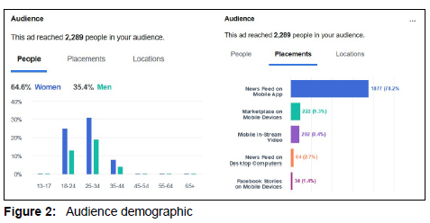 Figure 1 shows the number of individuals (2,289)) who were reached through the advertisement as well as the engagement, whereas Figure 2 shows what demographic was reached (64.6% female; 35.4%) male, predominantly aged between 225 and 34 years) as well as the place where the advertisement was seen (78 .22%%) via moblle devices). Seeking participants via the Facebook advertising campaign failed, as nobody provided his/her details by clicking the sign-up button. As this process was insufficient, it was supplemented by posting an invite to take part in the preject in a Bloemfontein classifieds page on Facebook as well as by sending direct messages to the researcher's friendsl with a further request to distribute the message. By combining these various methods of advertising. 220 individuals responded and received an email which contained the consent form.
