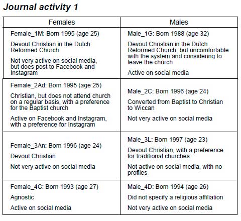 The first journal activity was distributed via the WhatsApp group on Monday, 30 September 2019. Participants were asked to write a short description of themselves, including their date of birth, thus providing the researcher with some attributive information on the participants.3 This first set of data was coded using attributive coding for the necessary descriptive information (Saldana 2009:55). For the purpose of this research project, the identity of the participants is kept anonymous. Participants are identified by gender and the first letters of their name. The results of the first journaling activity can be summarised as follows: