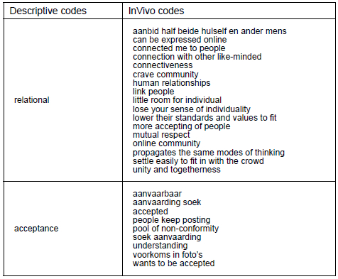 The first set of questions relating to the study was distributed on Monday, 7 October 2019, followed by a focus group on Friday, 11 October 2019. This process was continued for the following four weeks. All the participants were actively involved and interested in the topics and, therefore, did not require any motivation to keep them involved. The data of these activities were coded, using the first-cycle coding method of InVivo coding, which makes use of a word or short phrase from the actual language used by the participants (Saldana 2009:74), as in the example below: