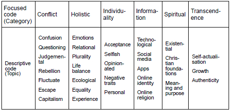 Some research has suggested that North Atlantic countries are living in a culture of authenticity. This culture has been stimulated by social and economic factors since the post-World War II prosperity boom, consumer culture, and increased urbanisation. This culture of authenticity has its origins in the 1960s' counterculture movements, with slogans such as "Do your own thing." and "Be yourself. Research among millennials shows that, in many ways, they continued where their parents left off and still embrace these slogans. It is the nature of this "counterculture" spirituality to reject labels, and this may be the reason why it is often overlooked (Watts 2018:245). The spiritual framework of millennials is characterised by a preoccupation with the inner life of the individual and adherence to a self-ethic, where individuals serve as their own source of guidance. This spirituality of the millennials focuses strongly on direct experience and is supported by an experiential epistemology (Watts 2018:245-246). In this research project, this is echoed in the focus-group categories holistic and transcendence, where participants expressed descriptive topics such as life balance, equality, experience, growth, and authenticity. These sentiments of self-development contribute to the unique identity for which these millennials are striving in their process of identity formation.