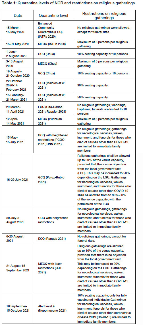 Table 1 shows the level of restrictions on religious gatherings in the NCR from the start of the pandemic until the date when the survey began to be conducted (12-31 October 2021).