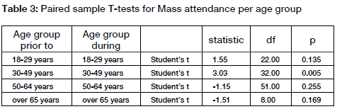 A different picture emerges when Mass attendance by women aged between 30 and 49 years is segregated from the Mass participation of the remainder of the congregation prior to and during the pandemic. The post hoc tests reveal that, among the three other age groups (18-29 years, 30-49 years, and 50-64 years), there was no significant increase/decrease in their participation in Mass activity. With women aged between 30 and 49 years, there was a significant decrease in Mass participation during the pandemic.